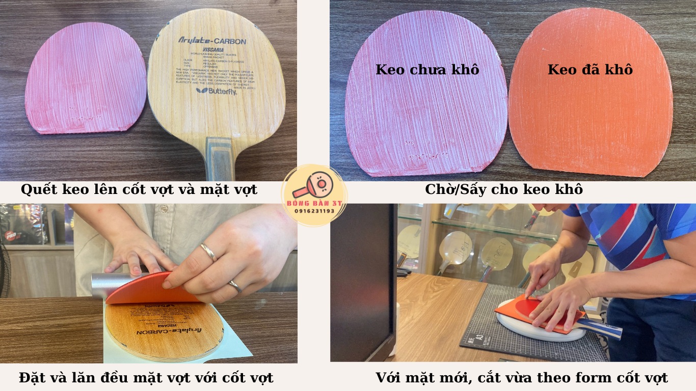 Vợt bóng bàn có cấu tạo gồm 2 phần là cốt vợt và mặt vợt. Sau một thời gian chơi bóng, mặt vợt sẽ bị bong khỏi cốt vợt hoặc độ ổn định/độ nảy không được như ban đầu. Để đảm bảo hiệu suất thi đấu, người chơi bóng cần dán lại mặt vợt bóng bàn bằng keo dán chuyên dụng để khả năng tiếp xúc và đàn hồi mặt vợt tốt hơn.