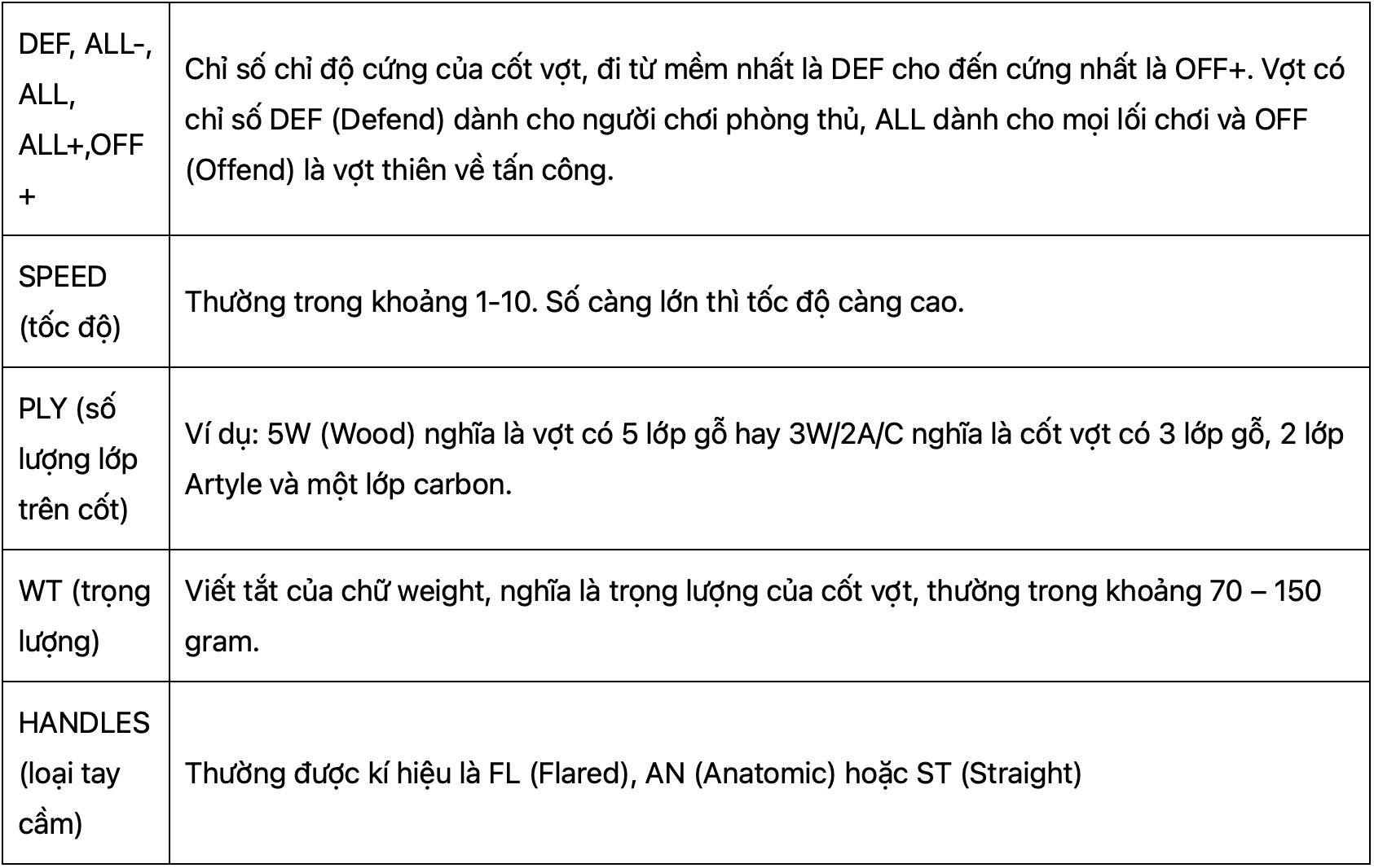 Để tìm được một cây vợt phù hợp, bạn phải hiểu được cây vợt của mình qua các thông số ghi trên vợt. Một số thông số thường thấy trên vợt như: